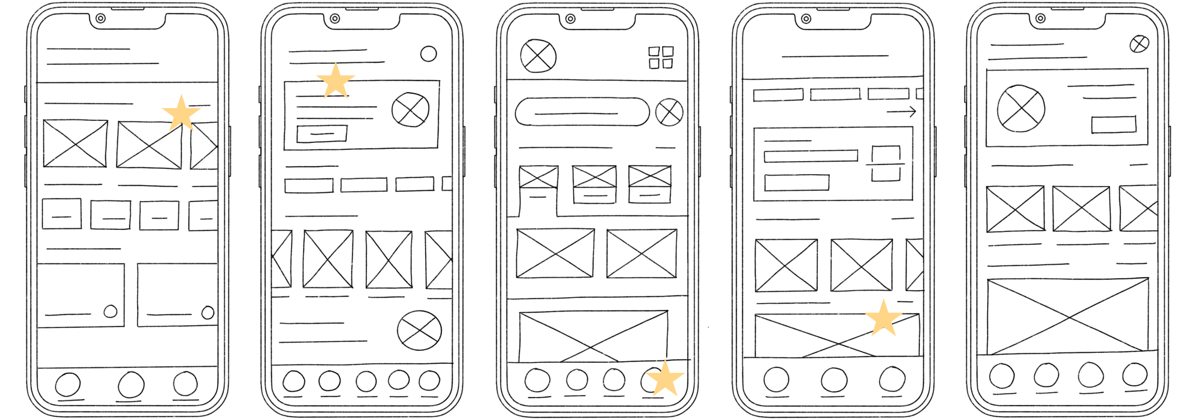 I then sketched out a structure on paper, digitized it and added details. Stars represent the sections used in the initial version of the Home screen.